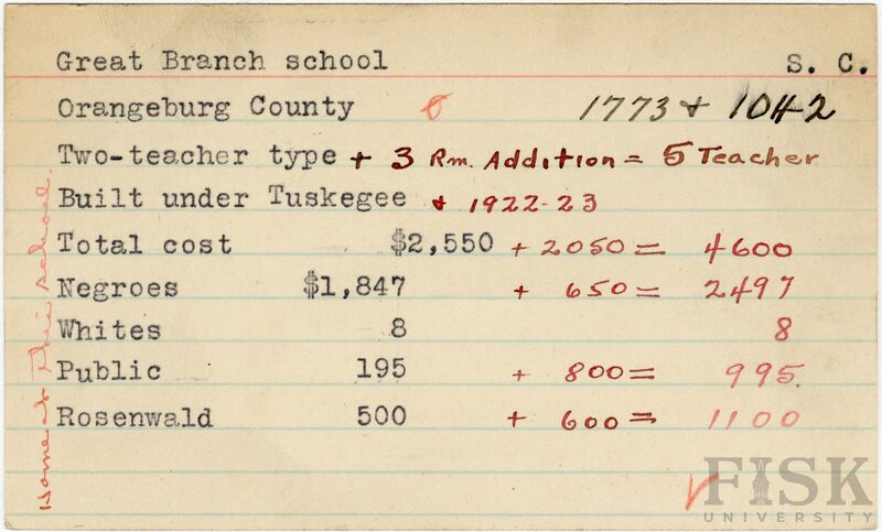 - School card from Rosenwald Fund for Great Branch School in Orangeburg County, South Carolina with handwritten additions to the teacher type, budget year, and budget contribution sections. Handwritten note on the card says, "Home at this school"