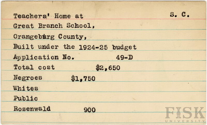 - School card from Rosenwald Fund for the teacher's home at Great Branch School in Orangeburg County, South Carolina