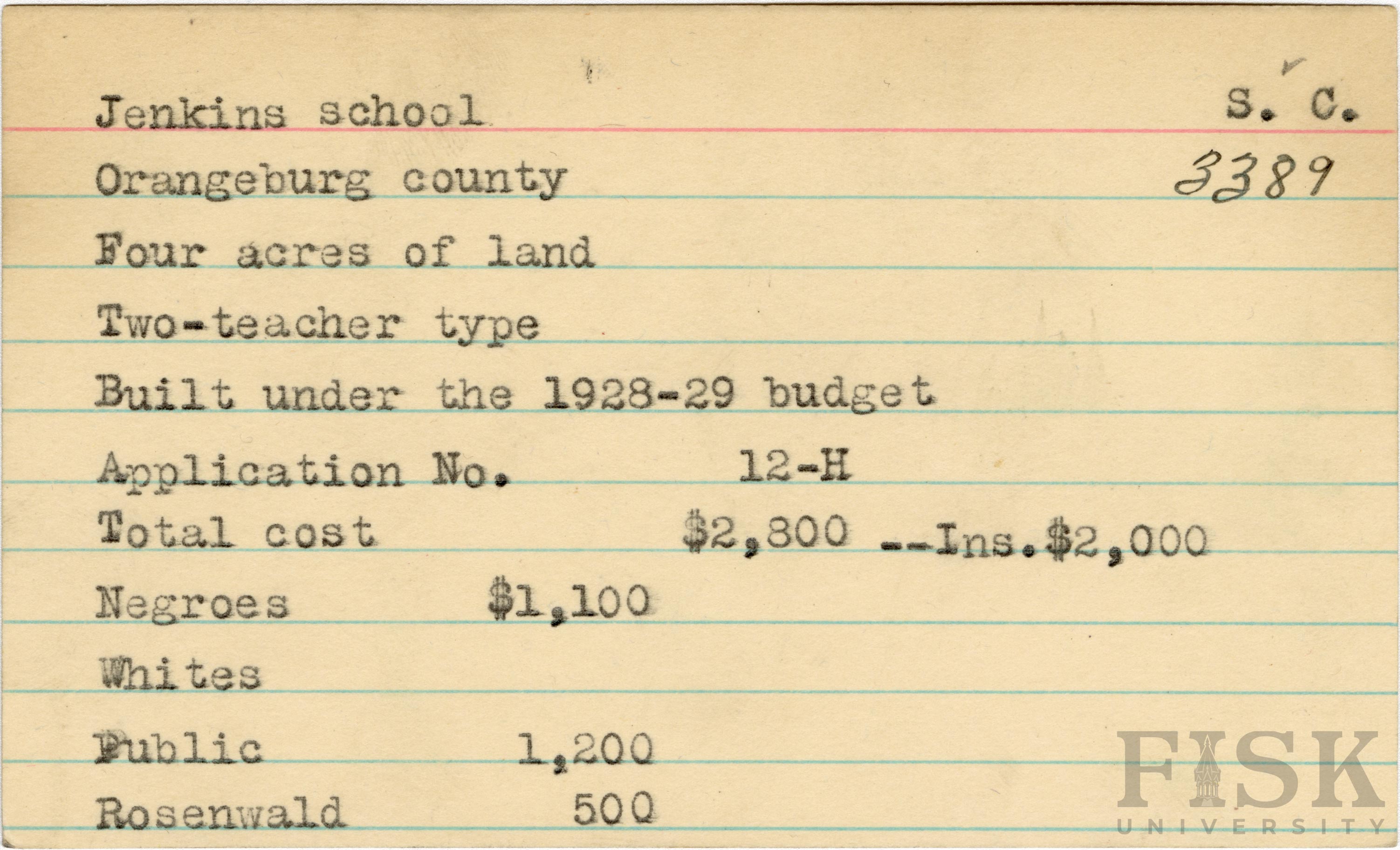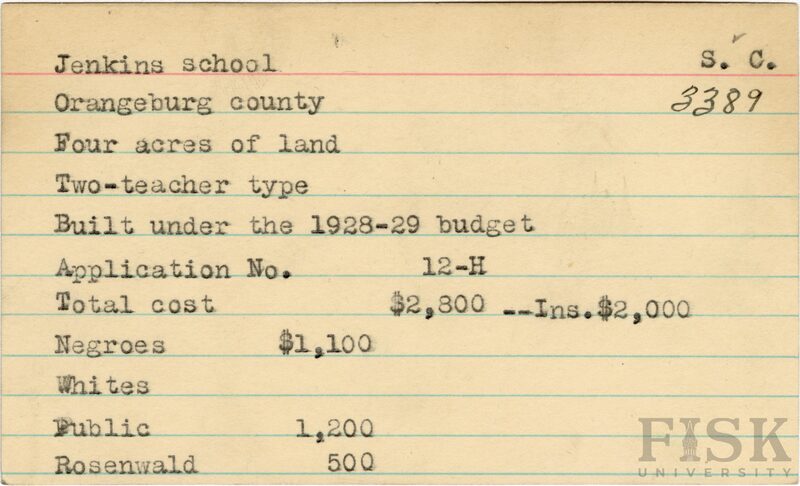 - School card from Rosenwald Fund for Jenkins School in Orangeburg County, South Carolina with a section added to the budget contributions that says, "Ins. $2,000"