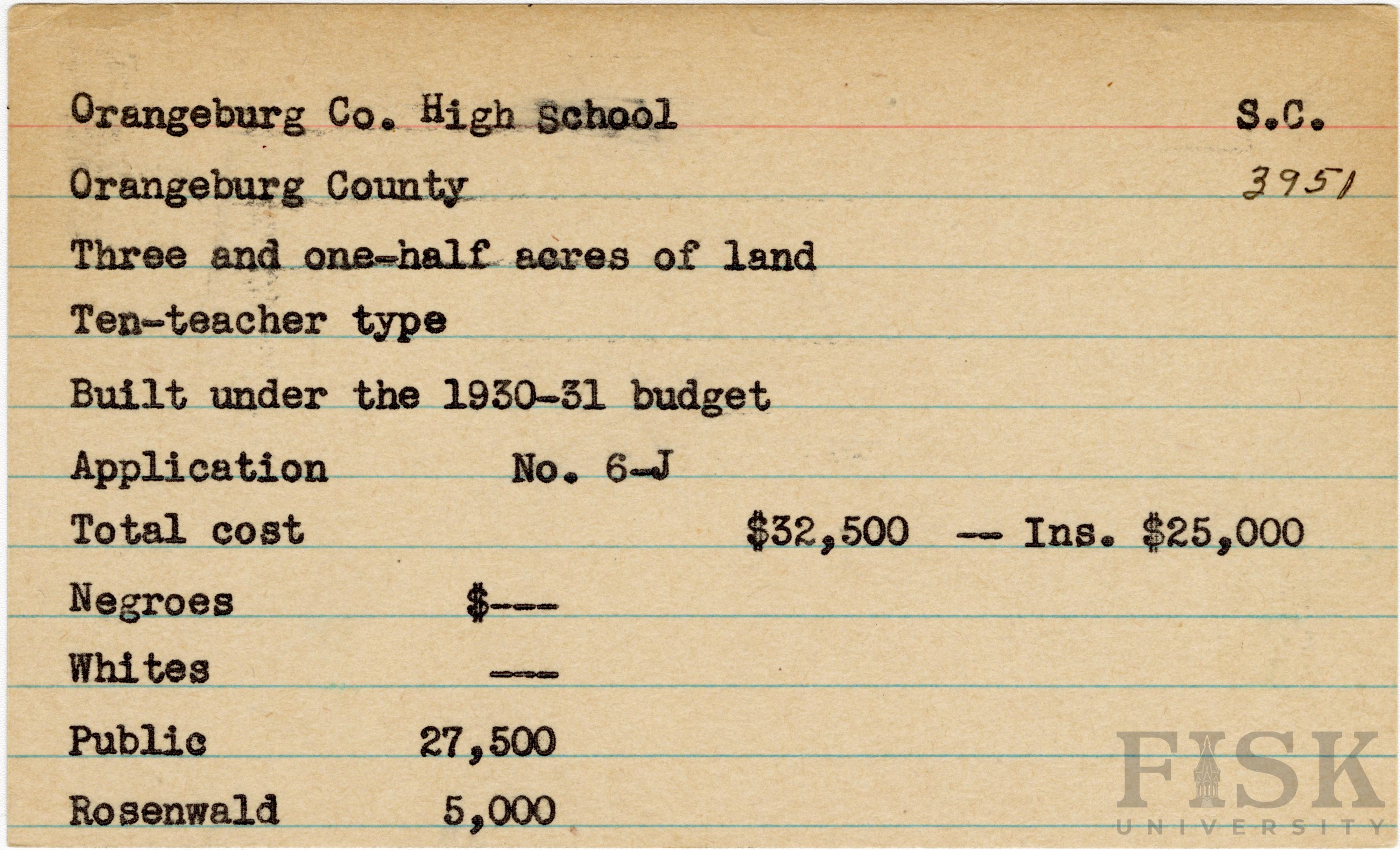 - School card from Rosenwald Fund for Orangeburg County High School in Orangeburg County, South Carolina with a section added to the budget contributions that says, "Ins. $25,000"