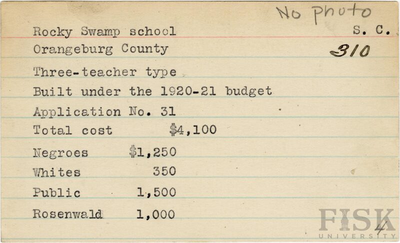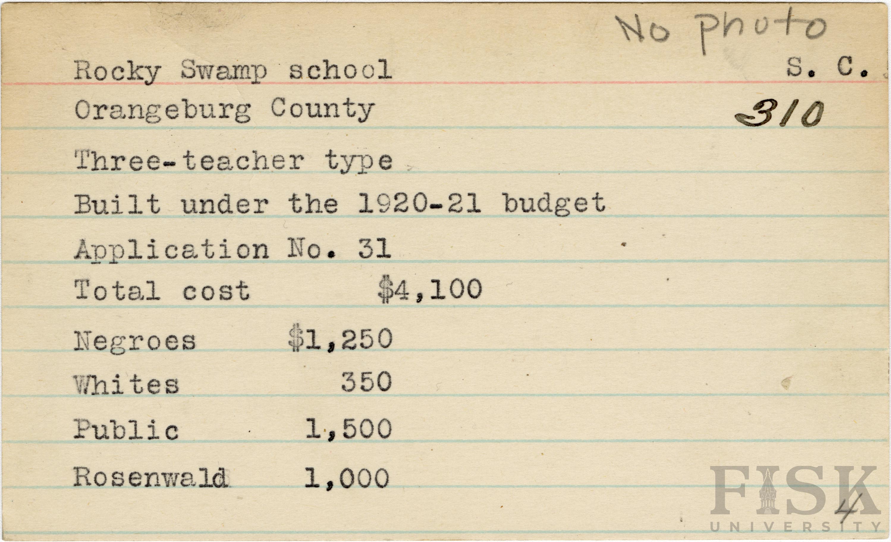 School card from Rosenwald Fund for Rocky Swamp School in Orangeburg County, South Carolina with a note on the card that says, "No photo"