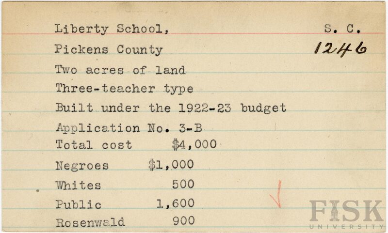 - School card from Rosenwald Fund for Liberty School in Pickens County, South Carolina