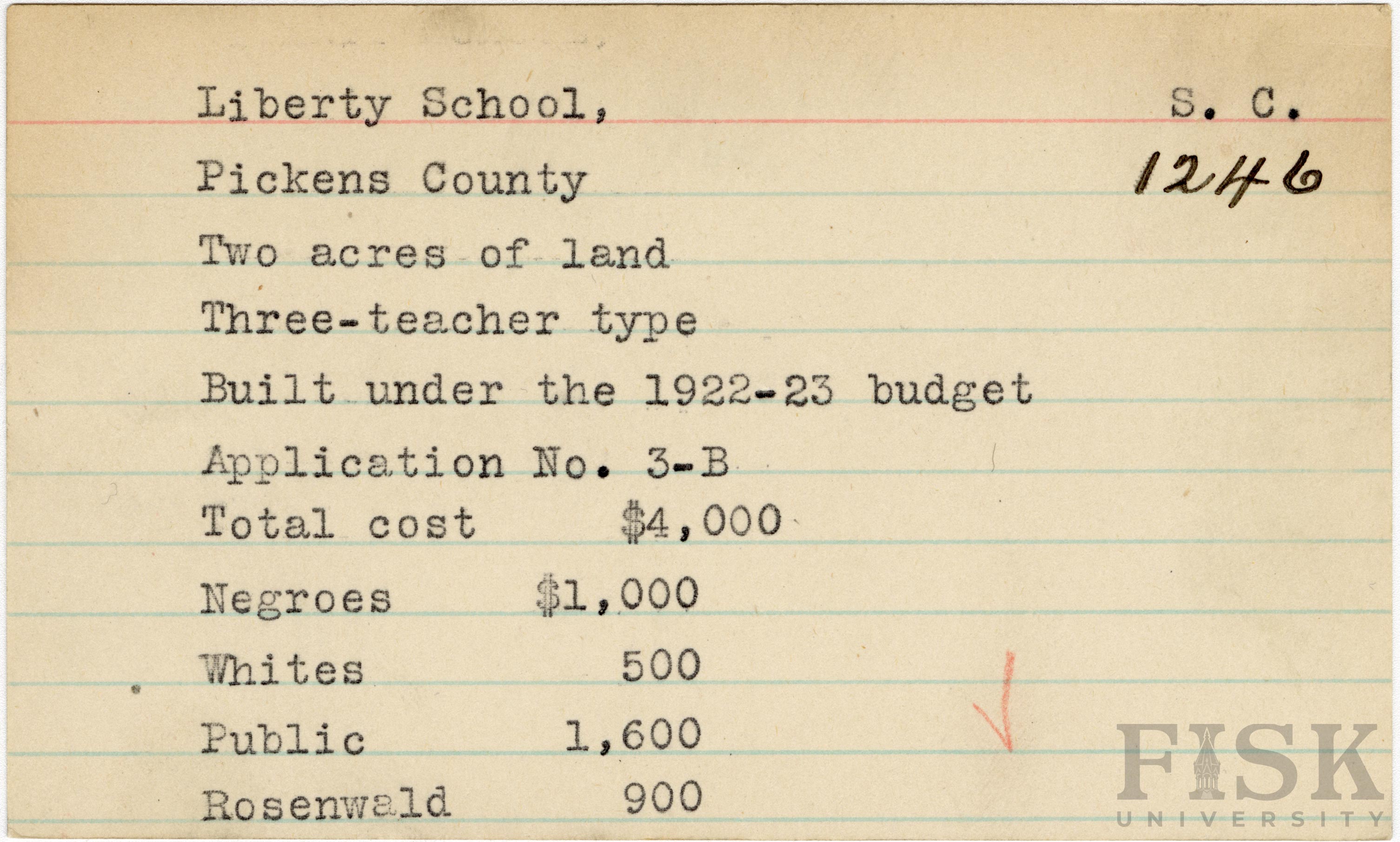 School card from Rosenwald Fund for Liberty School in Pickens County, South Carolina
