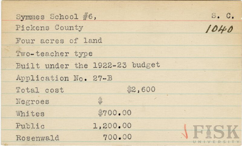 - School card from Rosenwald Fund for Symmes School No. 6 in Pickens County, South Carolina