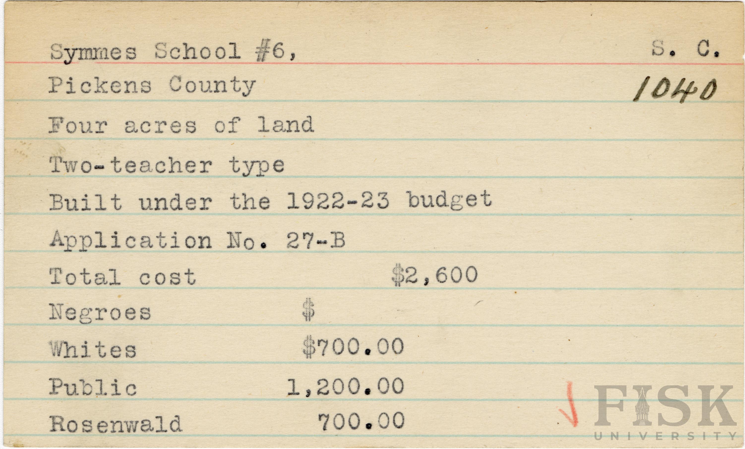 School card from Rosenwald Fund for Symmes School No. 6 in Pickens County, South Carolina