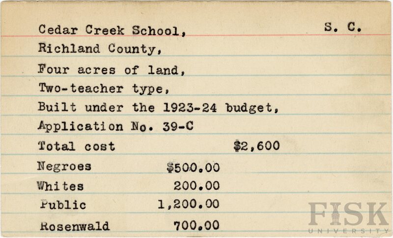 - School card from Rosenwald Fund for Cedar Creek School in Richland County, South Carolina