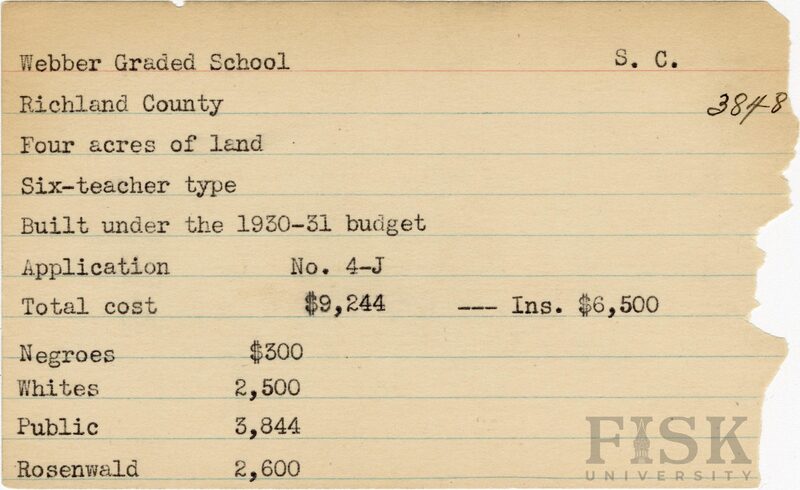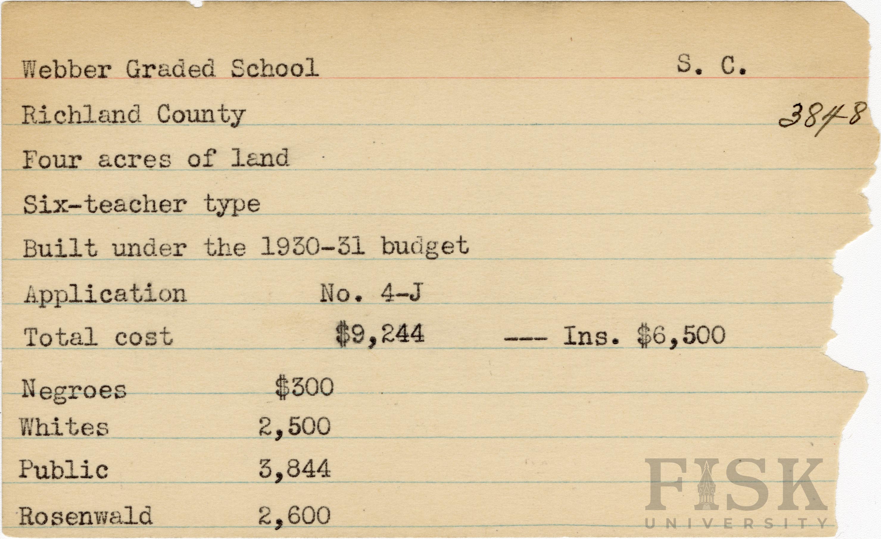 - School card from Rosenwald Fund for Webber Graded School in Richland County, South Carolina with a section added to the budget contributions that says, "Ins. $6,500"