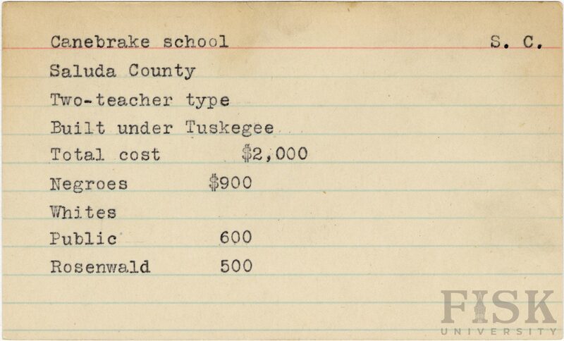 - School card from Rosenwald Fund for Canebrake School in Saluda County, South Carolina