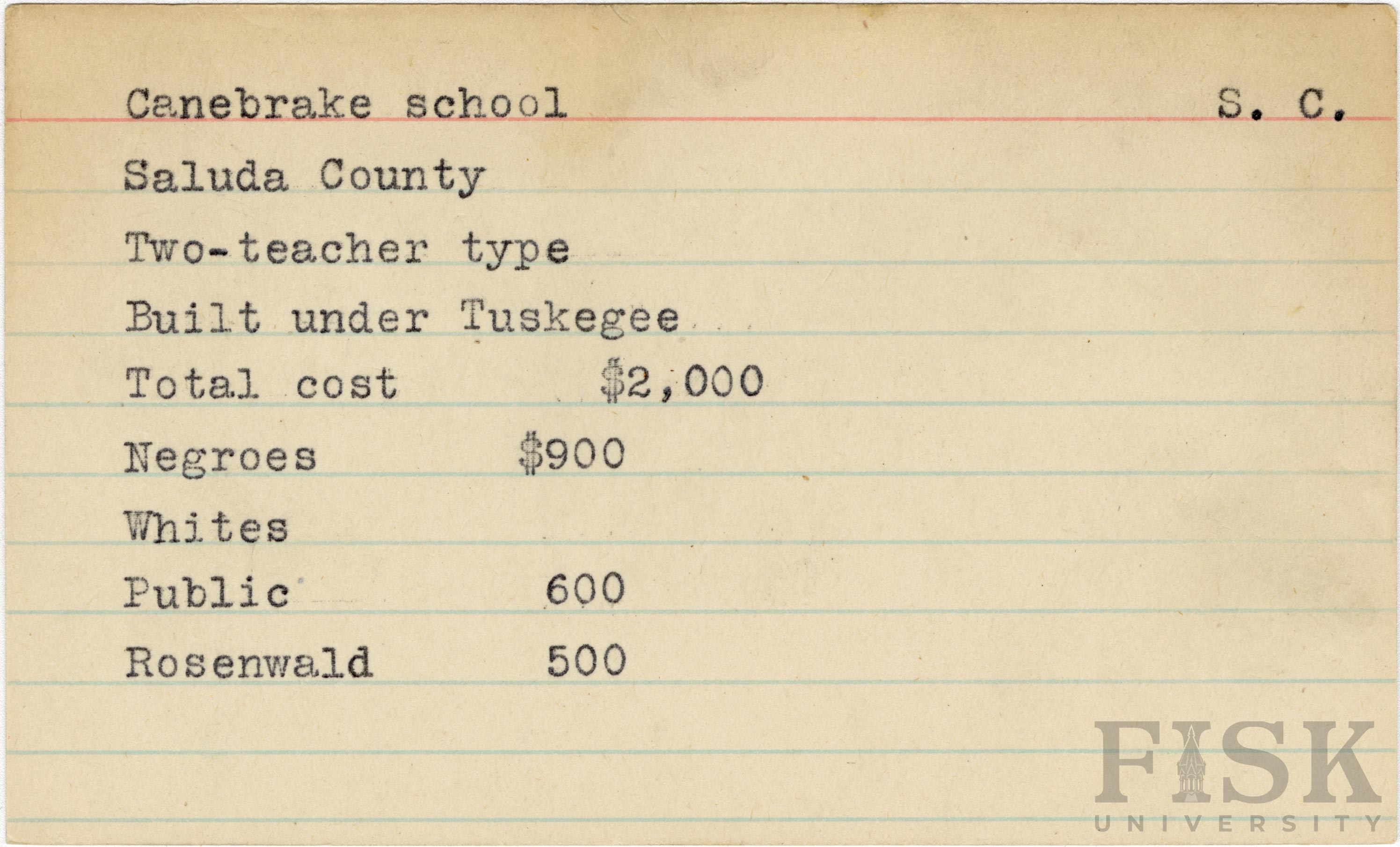 School card from Rosenwald Fund for Canebrake School in Saluda County, South Carolina