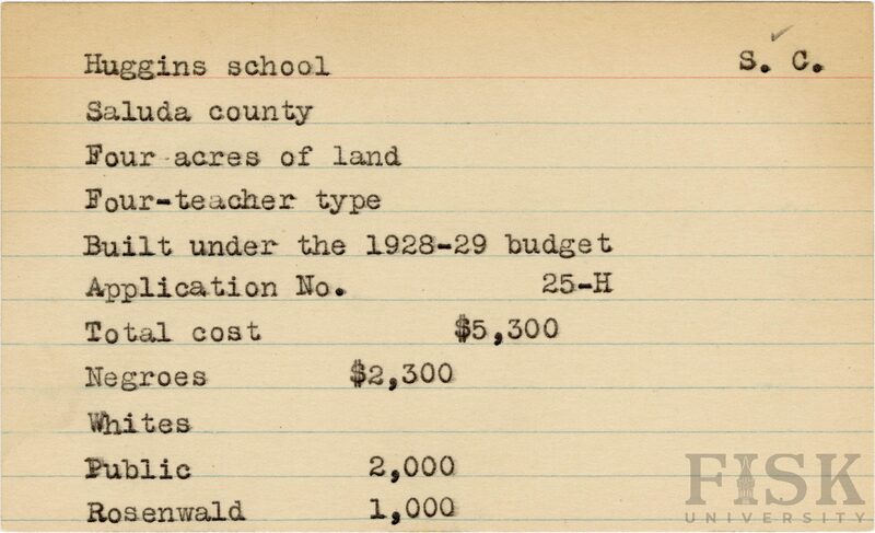 - School card from Rosenwald Fund for Huggins School in Saluda County, South Carolina