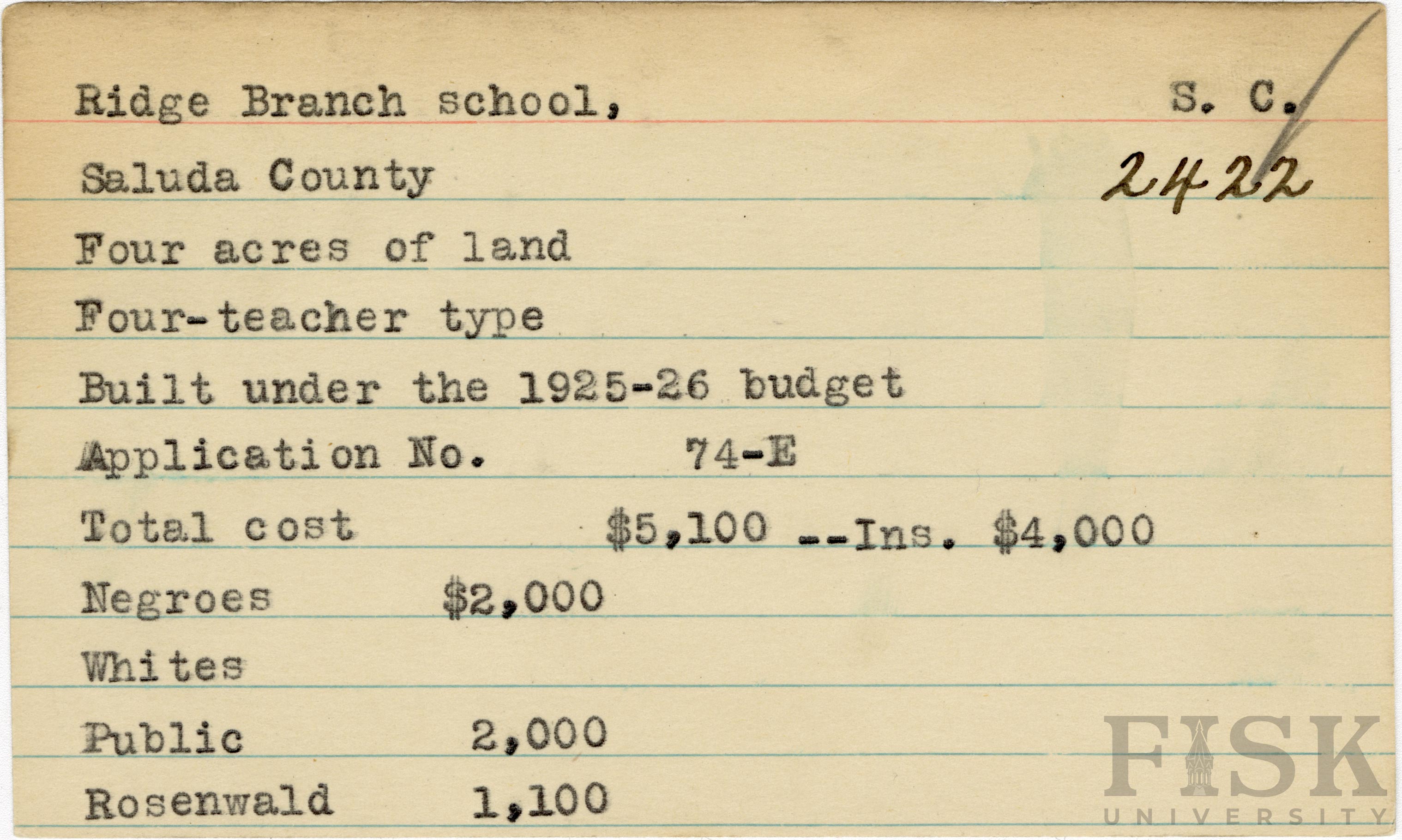 - School card from Rosenwald Fund for Ridge Branch School in Saluda County, South Carolina with a section added to the budget contributions that says, "Ins. $4,000"