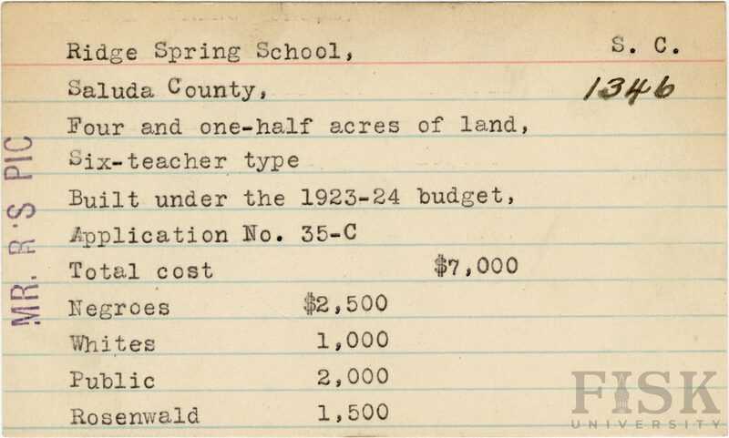- School card from Rosenwald Fund for Ridge Spring School in Saluda County, South Carolina with a note on the card that says, "Mr. R's Pic"