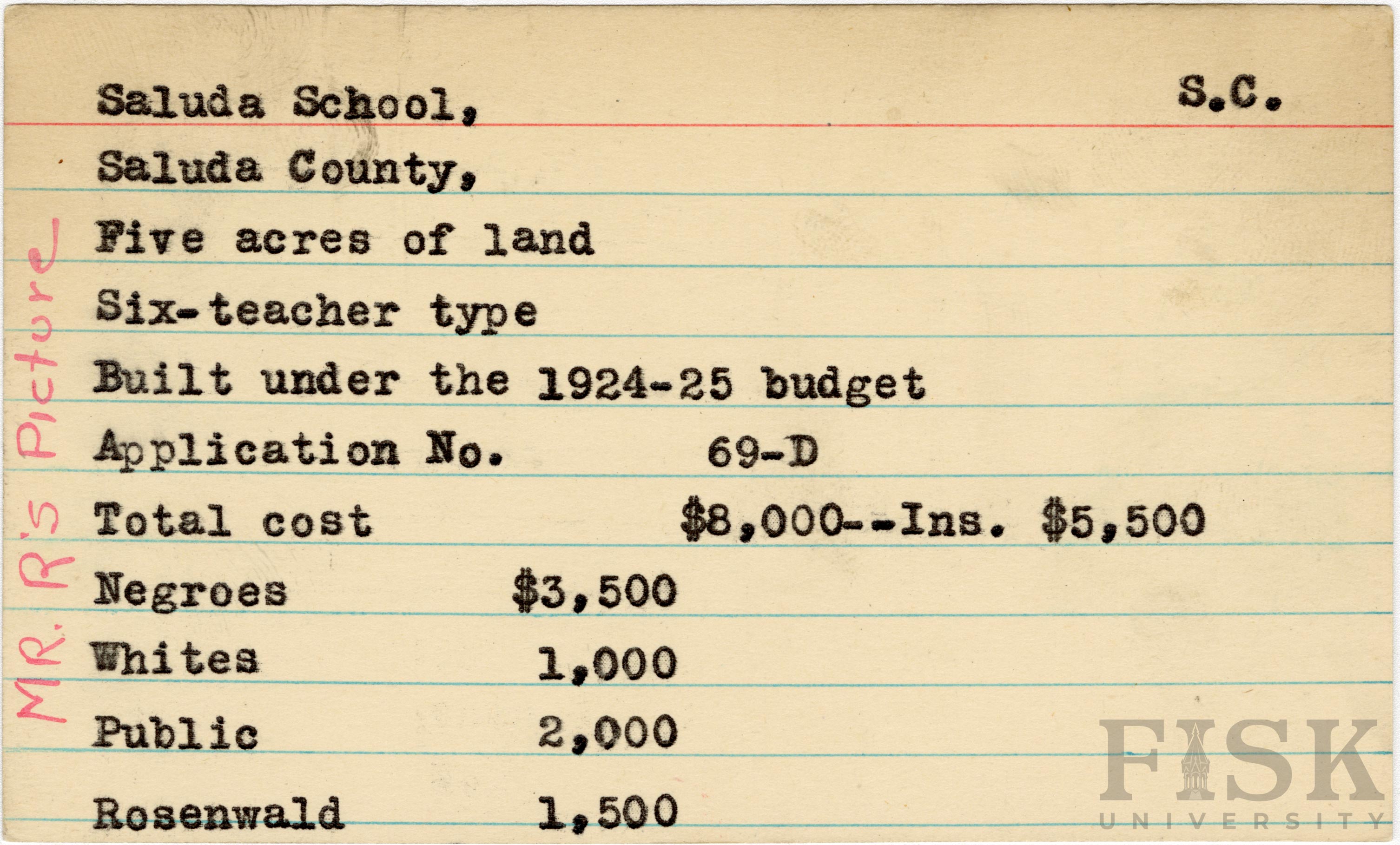 - School card from Rosenwald Fund for Saluda School in Saluda County, South Carolina with a section added to the budget contributions that says, "Ins. $5,500". A note on the card says, "Mr. R's Picture"