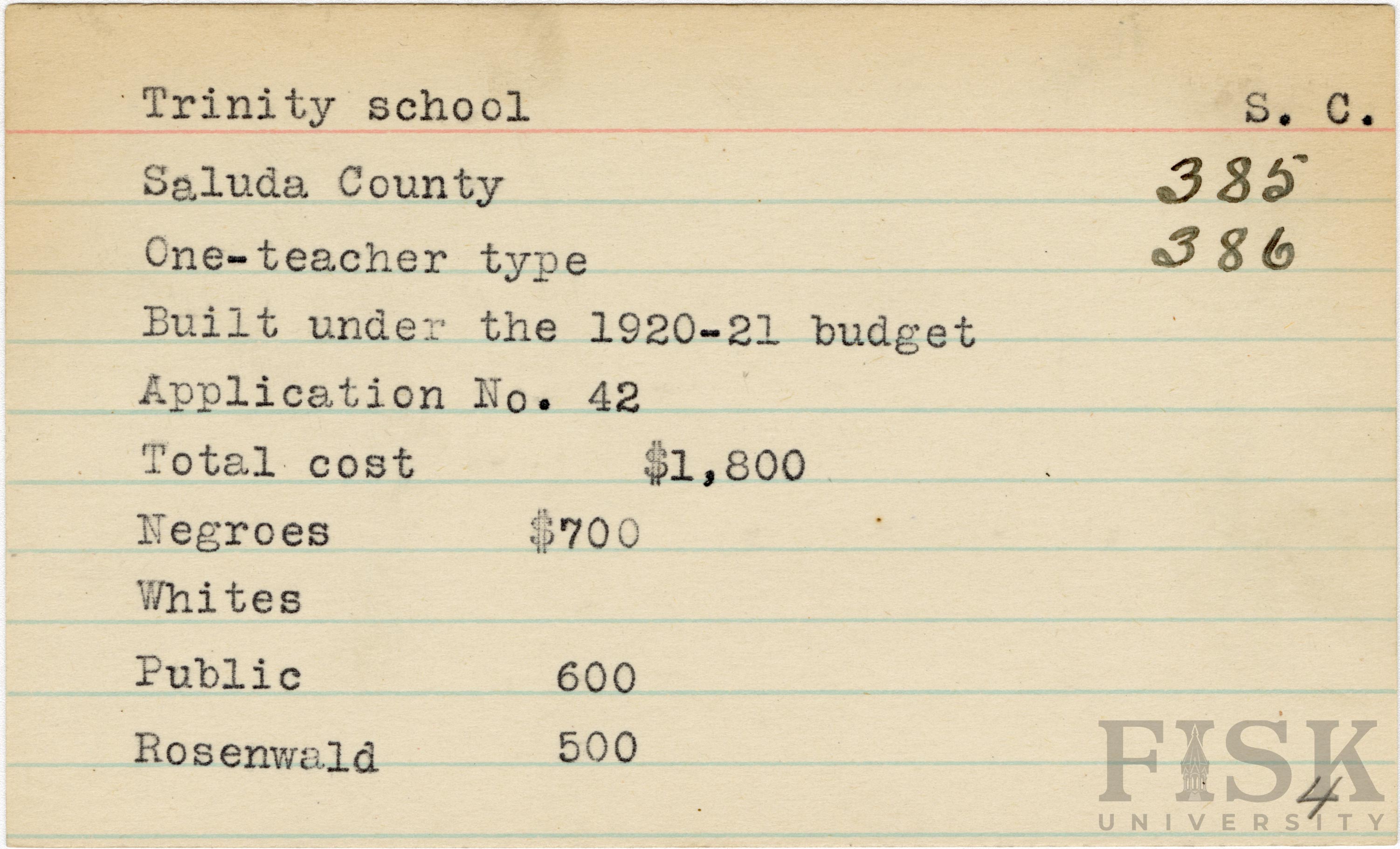 - School card from Rosenwald Fund for Trinity School in Saluda County, South Carolina