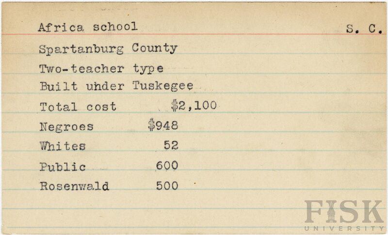 - School card from Rosenwald Fund for Africa School in Spartanburg County, South Carolina