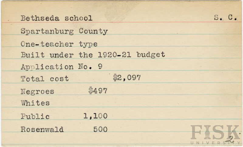 - School card from Rosenwald Fund for Bethseda School in Spartanburg County, South Carolina