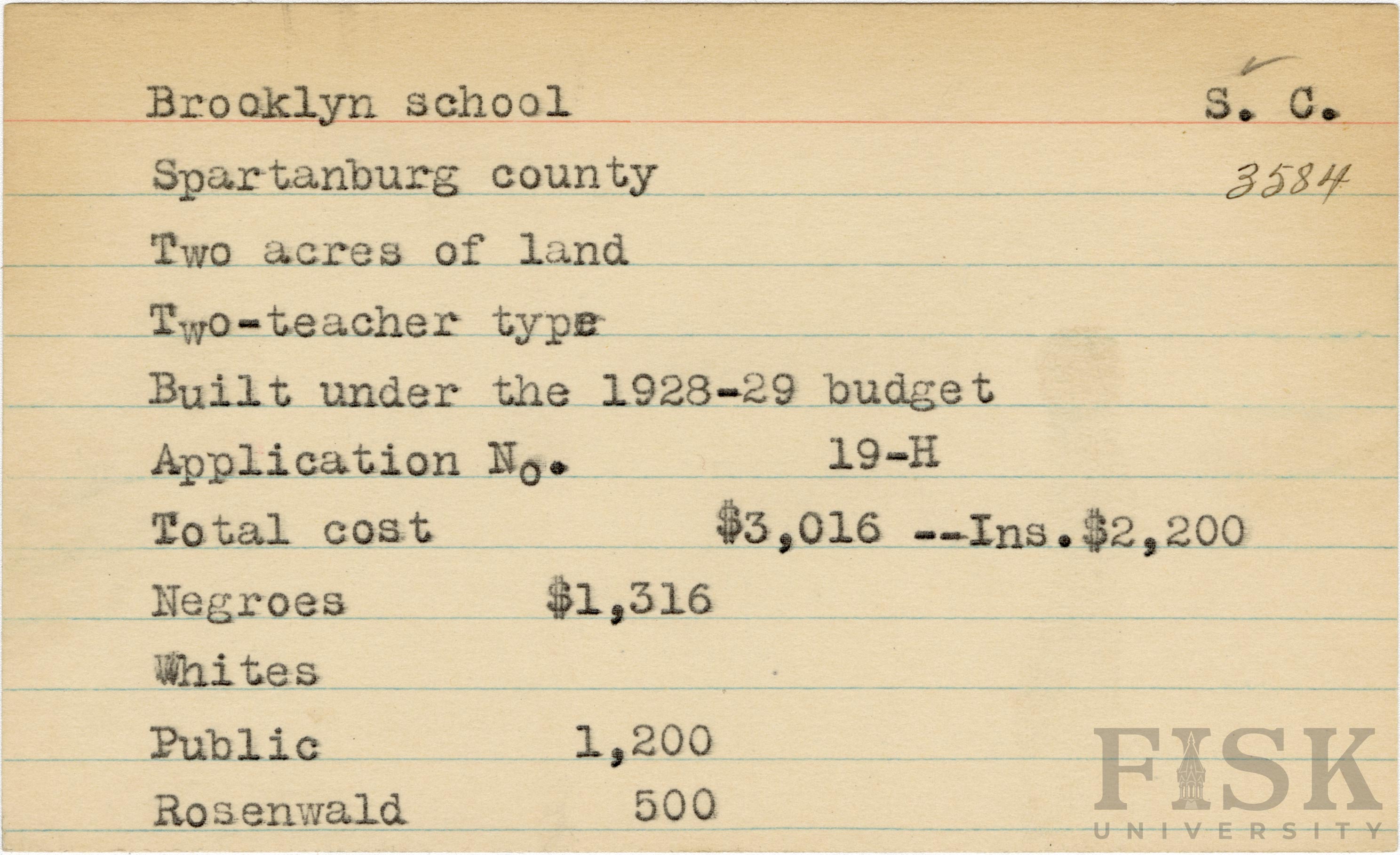- School card from Rosenwald Fund for Brooklyn School in Spartanburg County, South Carolina with a section added to the budget contributions that says, "Ins. $2,200"