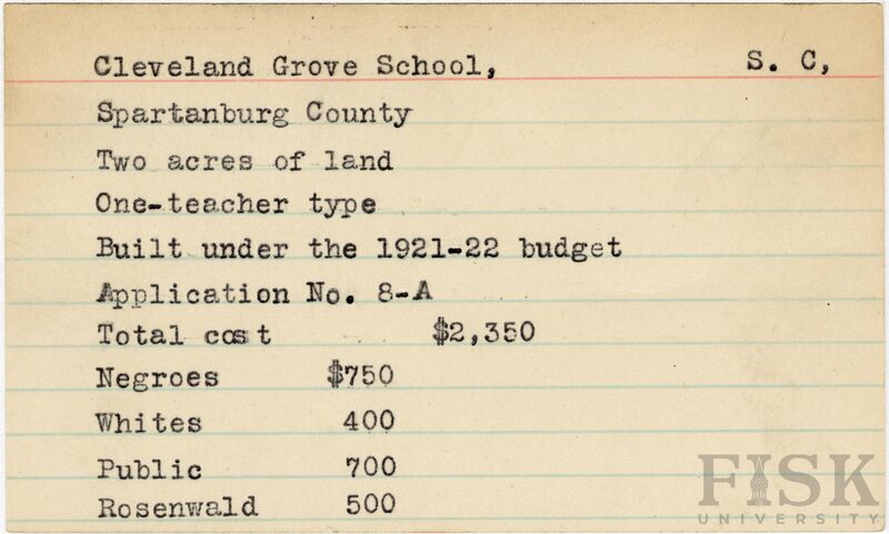 - School card from Rosenwald Fund for Cleveland Grove School in Spartanburg County, South Carolina