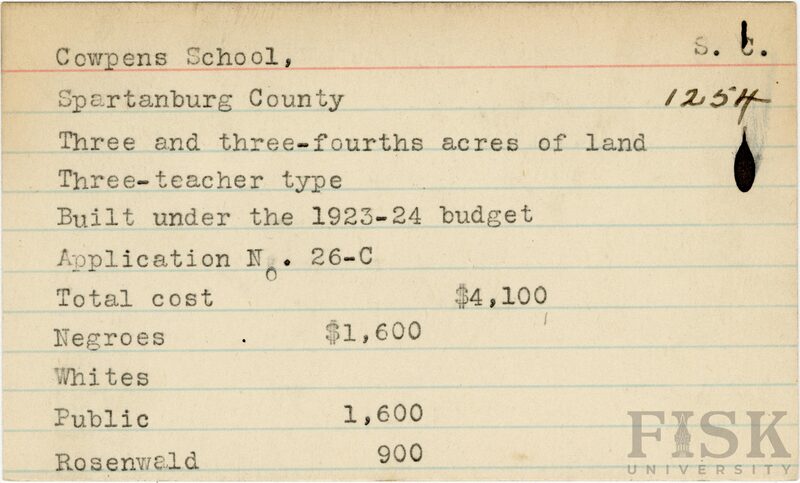 - School card from Rosenwald Fund for Cowpens School in Spartanburg County, South Carolina