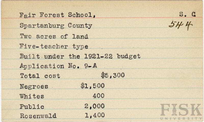 - School card from Rosenwald Fund for Fair Forest School in Spartanburg County, South Carolina