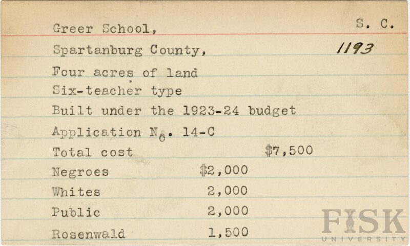 - School card from Rosenwald Fund for Greer School in Spartanburg County, South Carolina