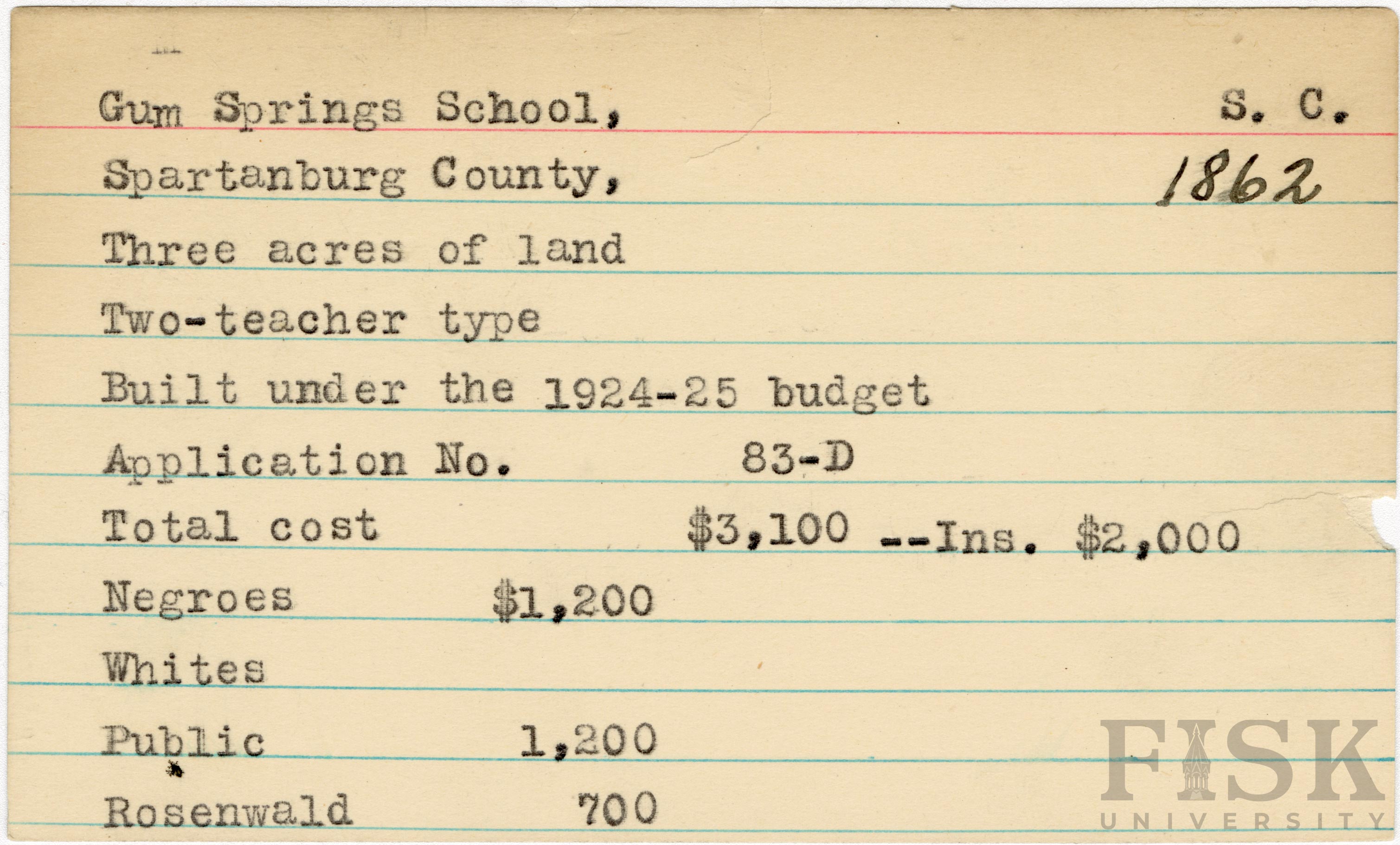 - School card from Rosenwald Fund for Gum Springs School in Spartanburg County, South Carolina with a section added to the budget contributions that says, "Ins. $2,000"
