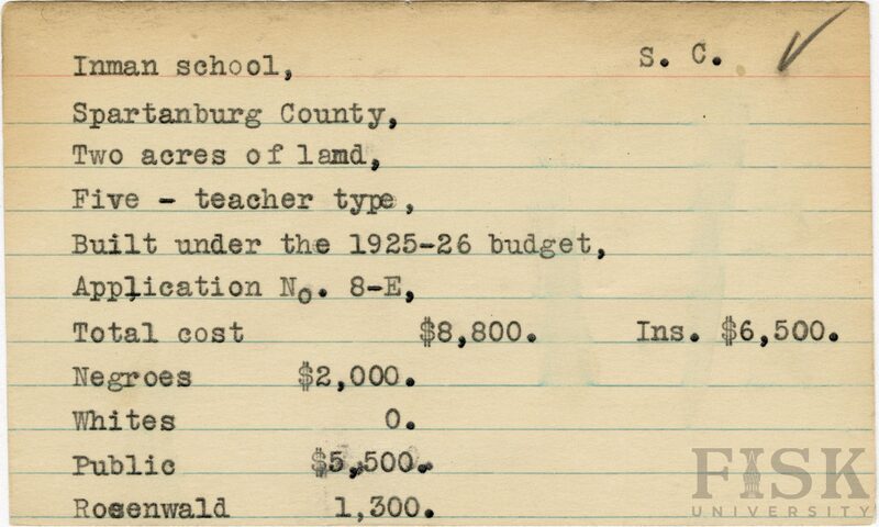 - School card from Rosenwald Fund for Inman School in Spartanburg County, South Carolina with a section added to the budget contributions that says, "Ins. $6,500"