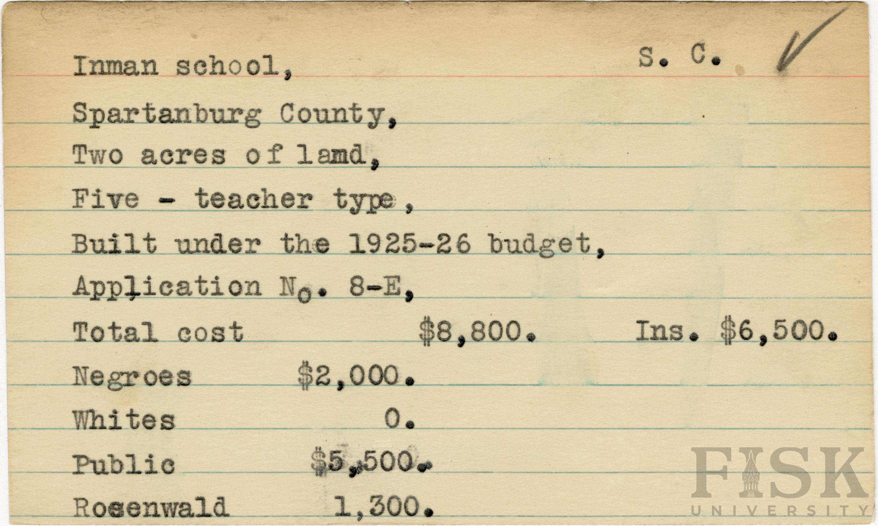 School card from Rosenwald Fund for Inman School in Spartanburg County, South Carolina with a section added to the budget contributions that says, "Ins. $6,500"