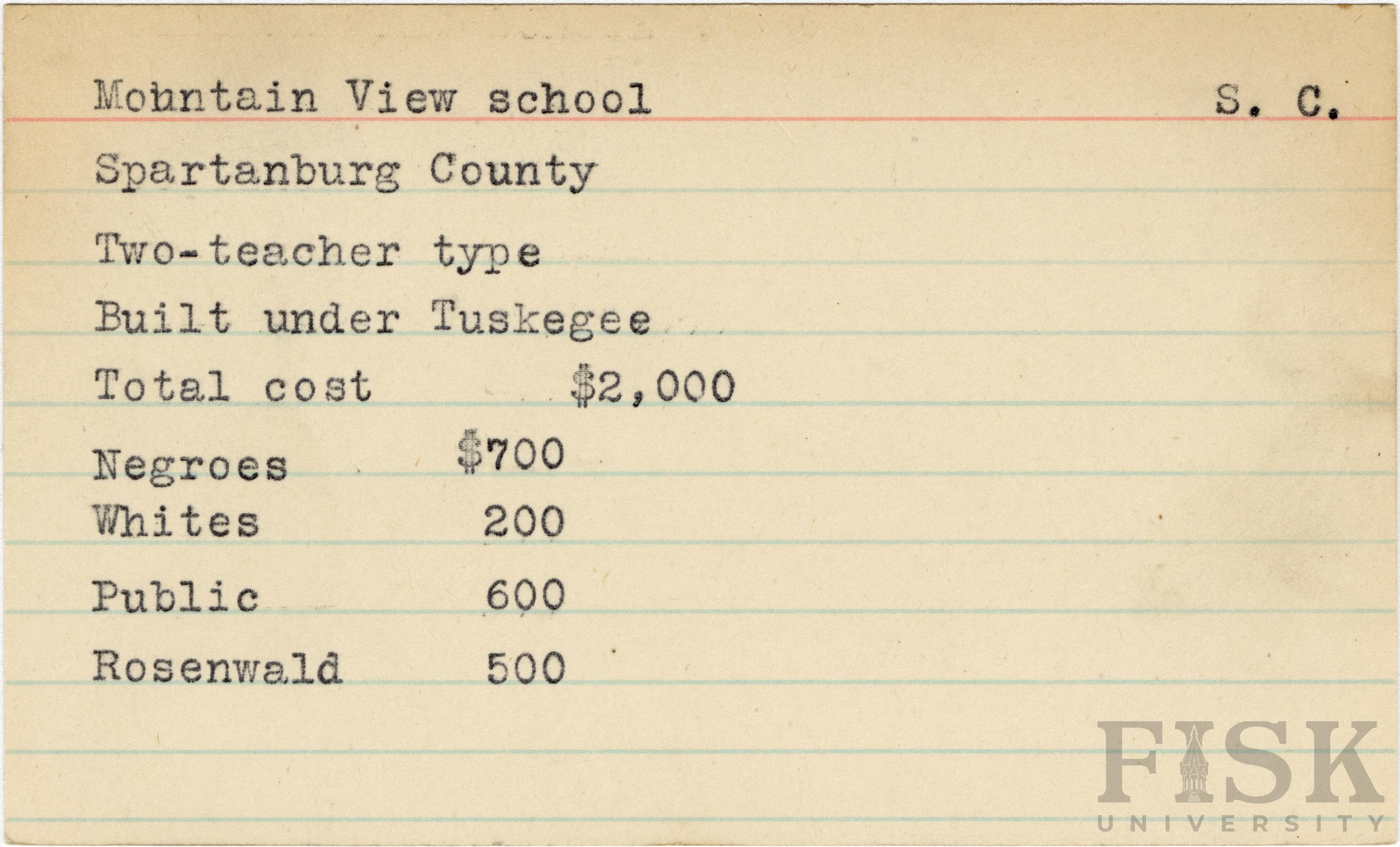 - School card from Rosenwald Fund for Mountain View School in Spartanburg County, South Carolina