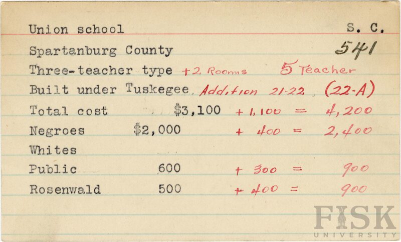 School card from Rosenwald Fund for Union School in Spartanburg County, South Carolina with handwritten additions to the teacher type, budget year, application number, and budget contribution sections