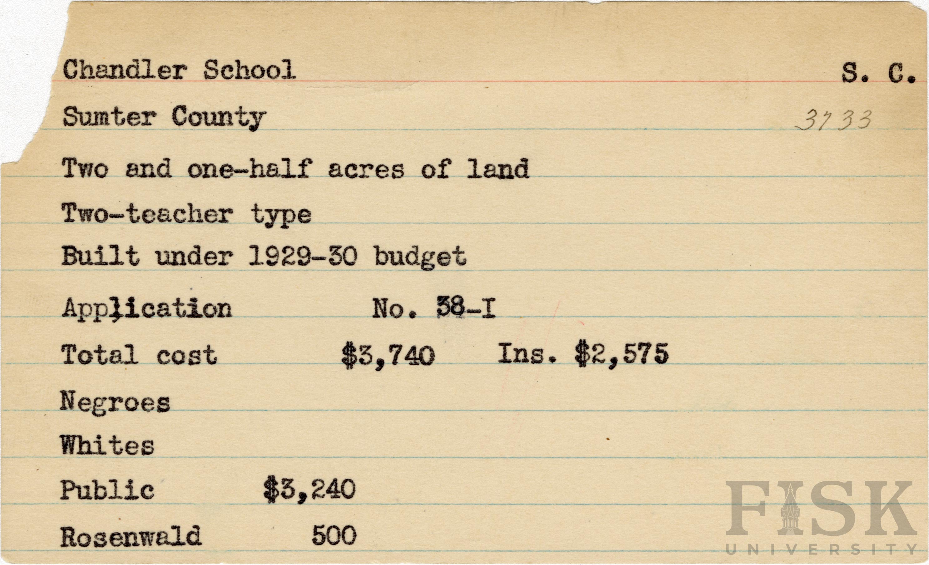 - School card from Rosenwald Fund for Chandler School in Sumter County, South Carolina with a section added to the budget contributions that says, "Ins. $2,575"