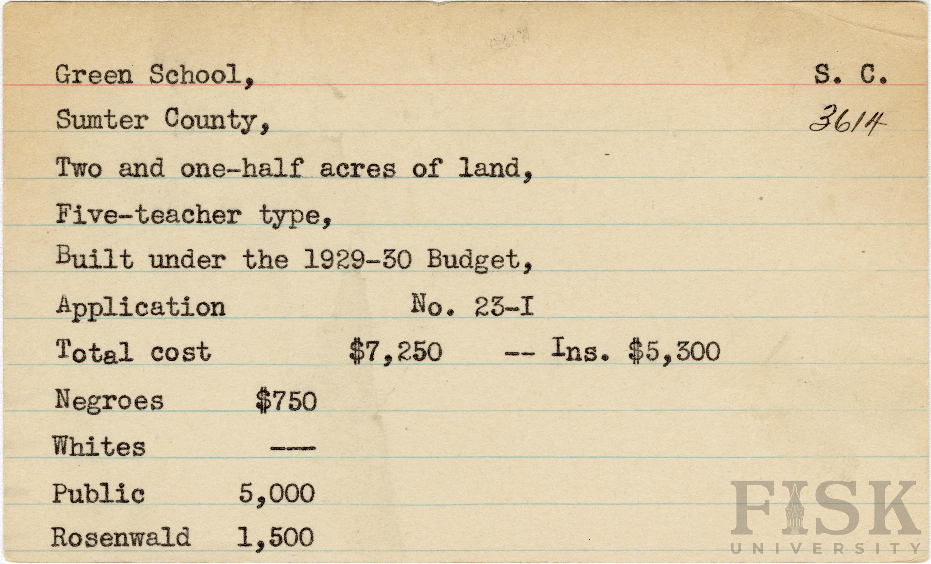 - School card from Rosenwald Fund for Green School in Sumter County, South Carolina with a section added to the budget contributions that says, "Ins. $5,300"