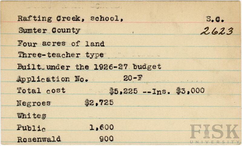 School card from Rosenwald Fund for Rafting Creek School in Sumter County, South Carolina with a section added to the budget contributions that says, "Ins. $3,000"