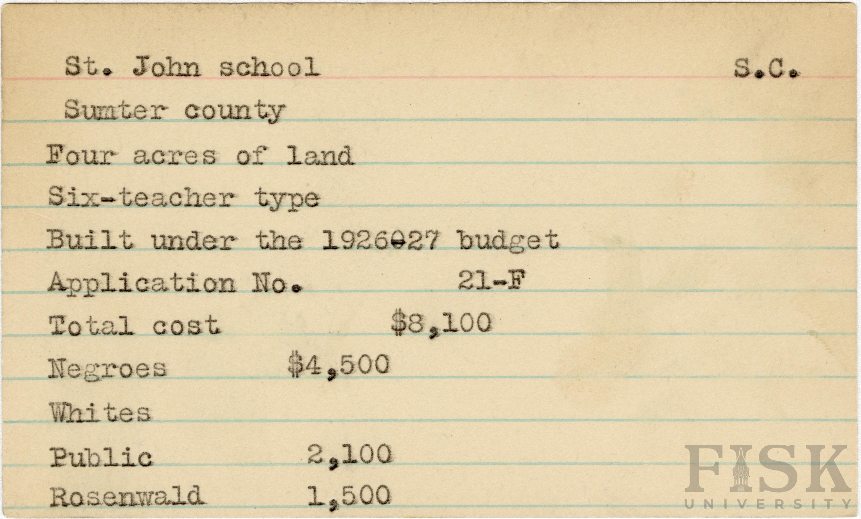 - School card from Rosenwald Fund for St. John School in Sumter County, South Carolina
