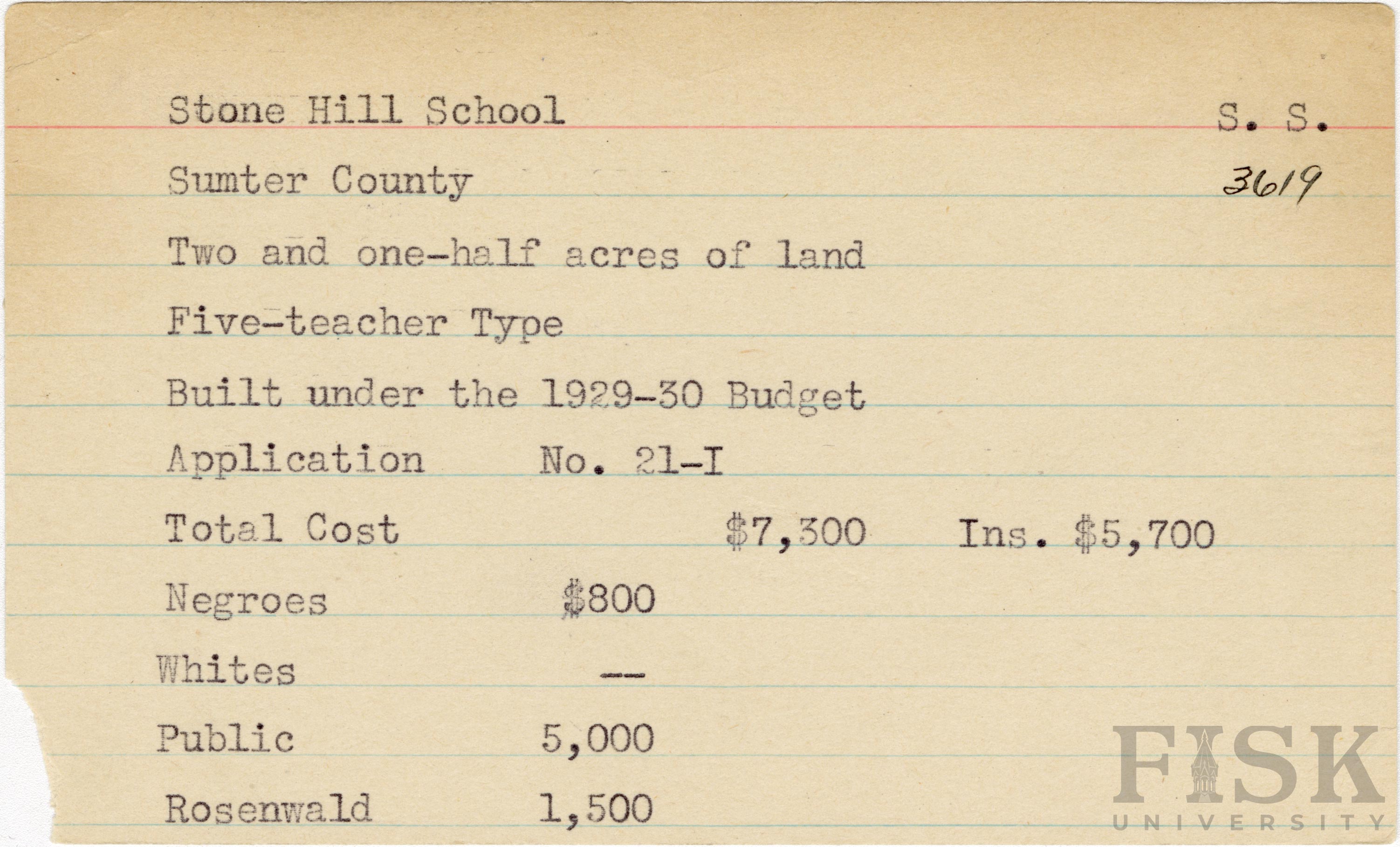 - School card from Rosenwald Fund for Stone Hill School in Sumter County, South Carolina with a section added to the budget contributions that says, "Ins. $5,700"