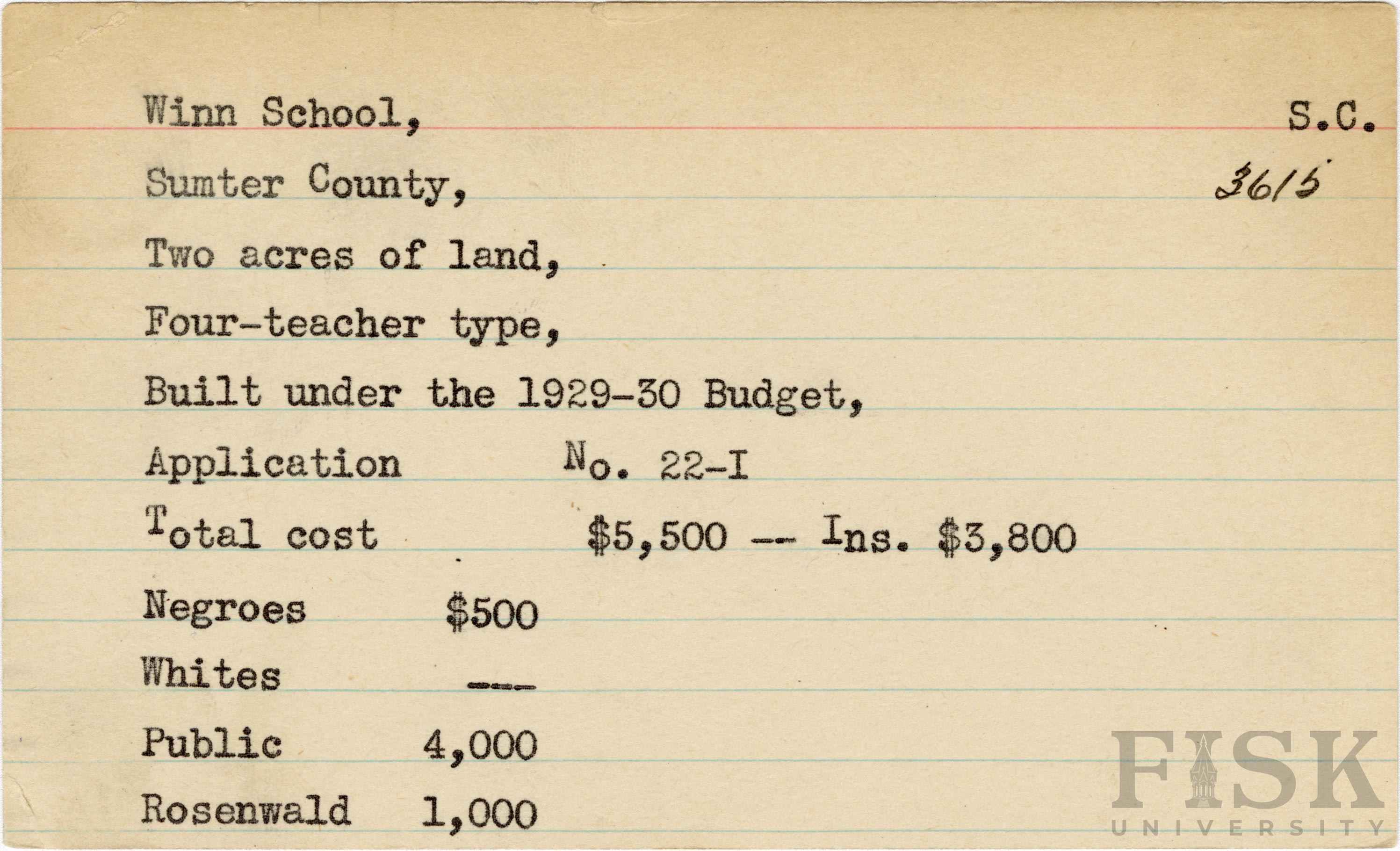 - School card from Rosenwald Fund for Winn School in Sumter County, South Carolina with a section added to the budget contributions that says, "Ins. $3,800"