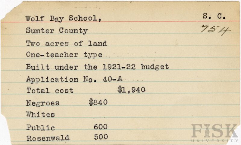 - School card from Rosenwald Fund for Wolf Bay School in Sumter County, South Carolina