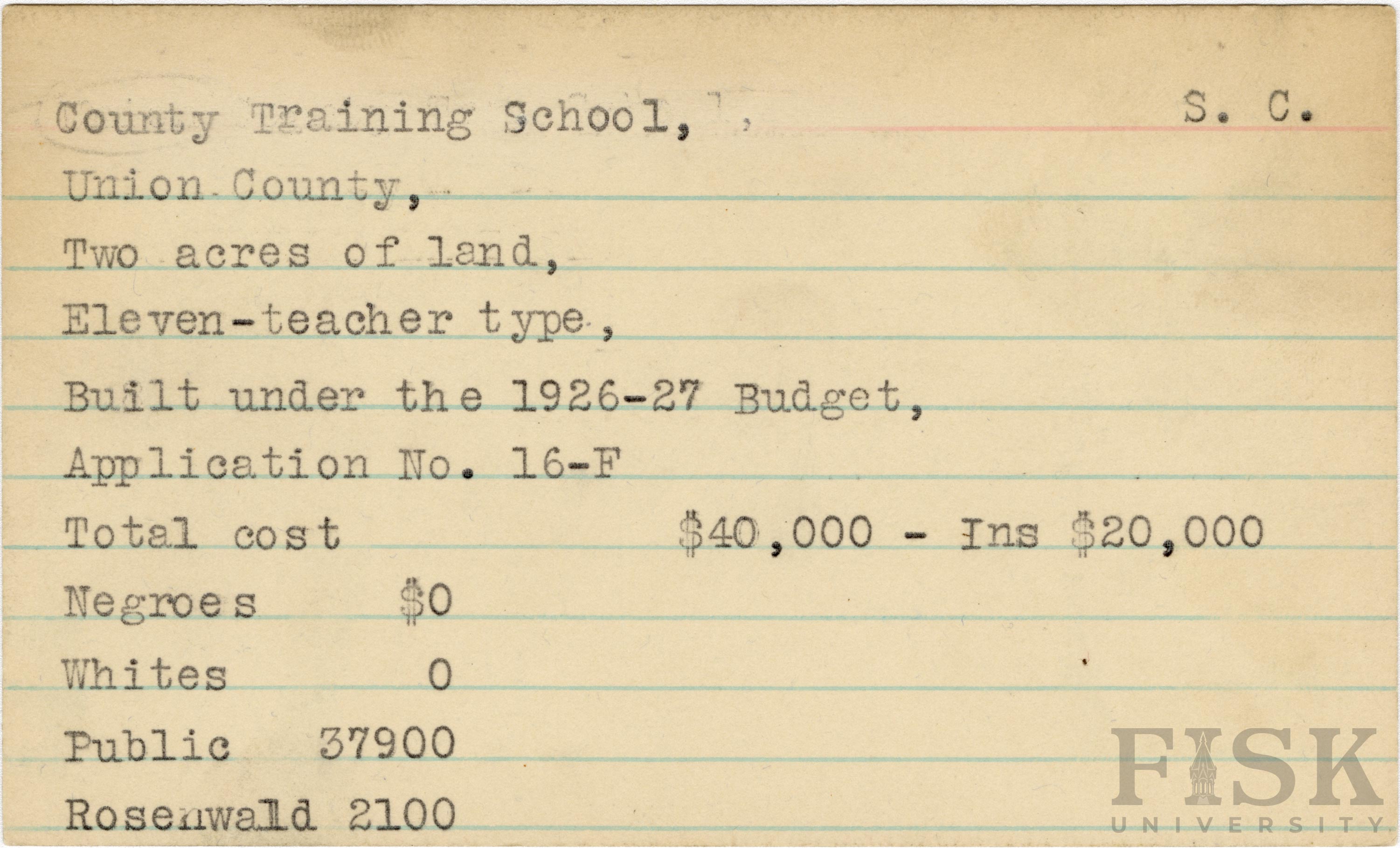 - School card from Rosenwald Fund for County Training School in Union County, South Carolina with a section added to the budget contributions that says, "Ins. $20,000"