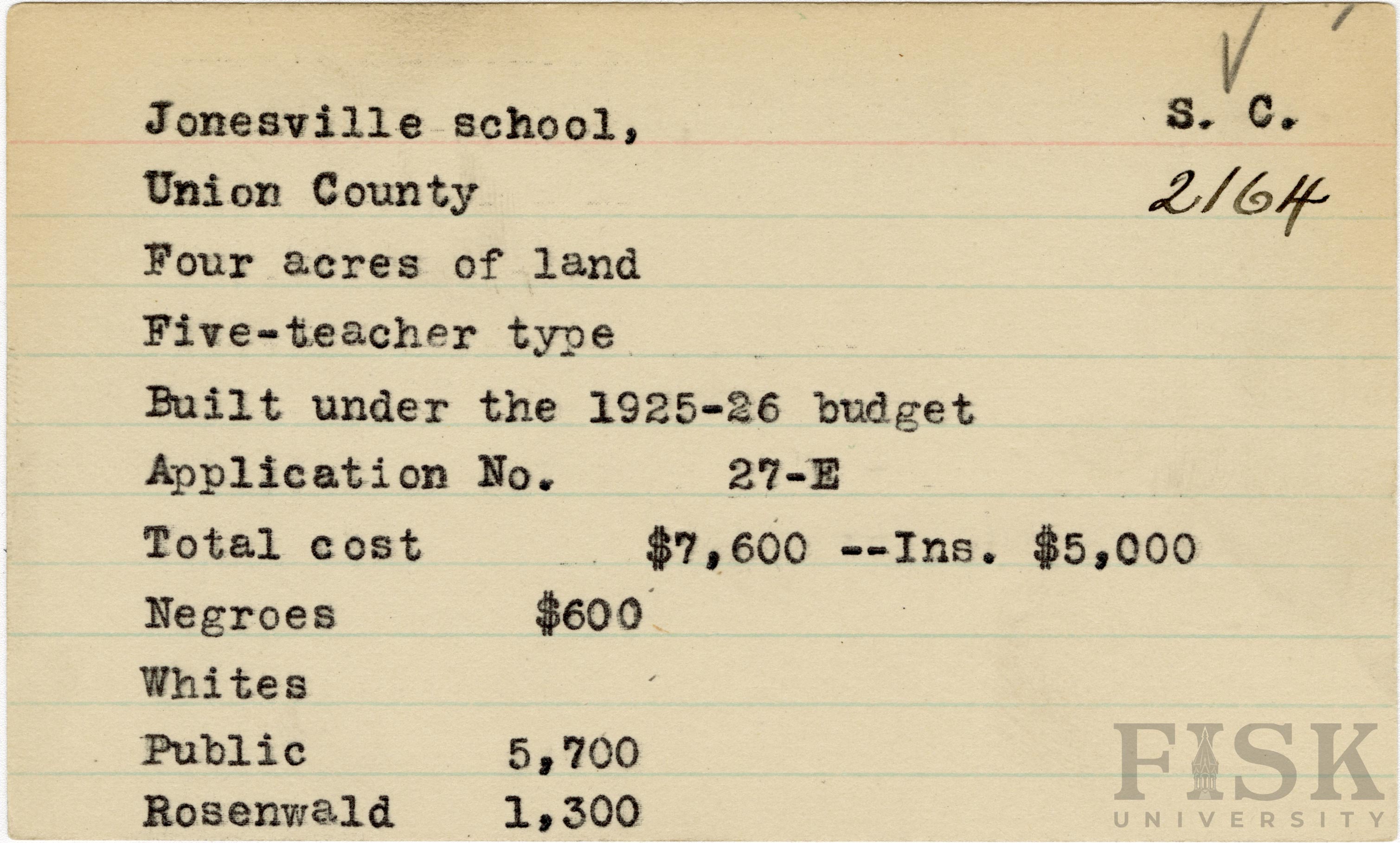 - School card from Rosenwald Fund for Jonesville School in Union County, South Carolina with a section added to the budget contributions that says, "Ins. $5,000"