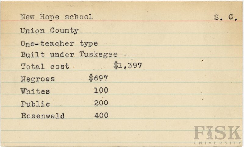 - School card from Rosenwald Fund for New Hope School in Union County, South Carolina