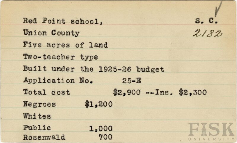 - School card from Rosenwald Fund for Red Point School in Union County, South Carolina with a section added to the budget contributions that says, "Ins. $2,300"
