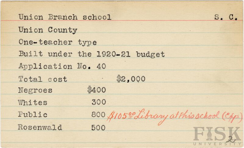 School card from Rosenwald Fund for Union Branch School in Union County, South Carolina with a note on the card that says, "$105.00 library at this school (Exp)"