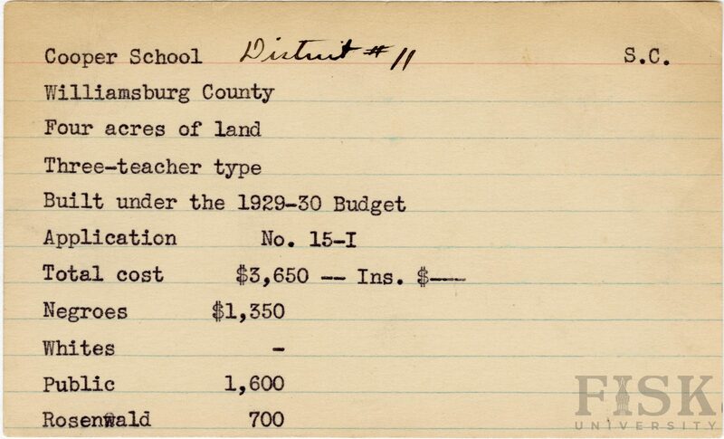 - School card from Rosenwald Fund for Cooper School in Williamsburg County, South Carolina with a note on the card that says, "District #11"