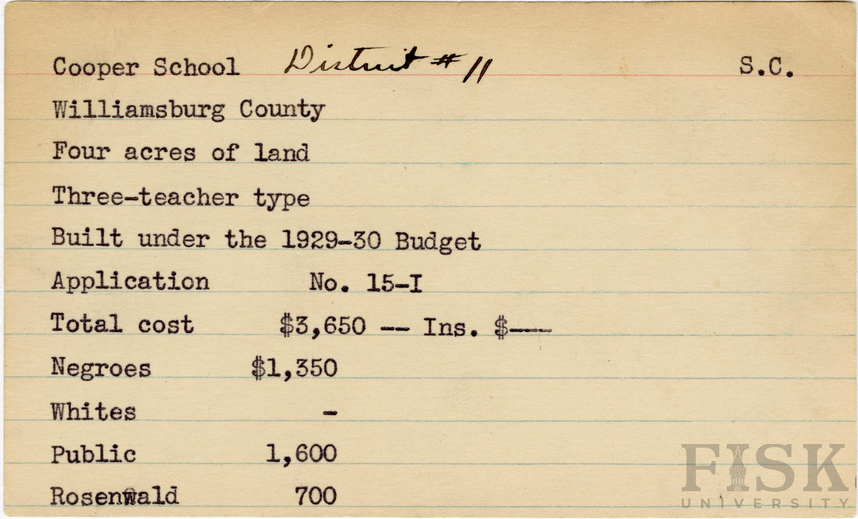 School card from Rosenwald Fund for Cooper School in Williamsburg County, South Carolina with a note on the card that says, "District #11"