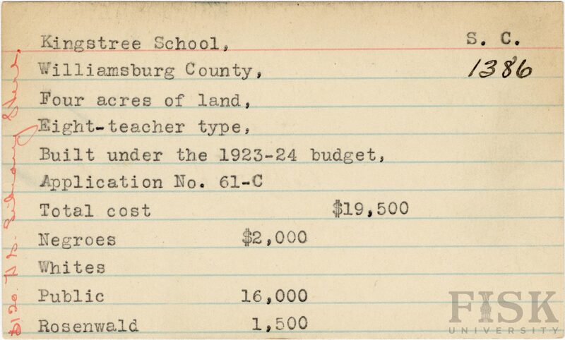 - School card from Rosenwald Fund for Kingstree School in Williamsburg County, South Carolina with a note on the card that says, "$120 H. S. library here"