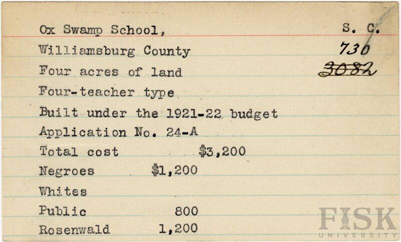 - School card from Rosenwald Fund for Ox Swamp School in Williamsburg County, South Carolina