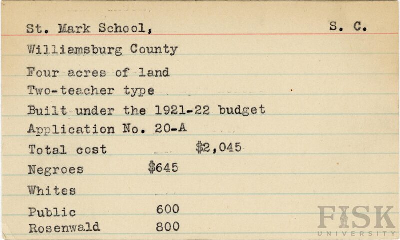 - School card from Rosenwald Fund for St. Mark School in Williamsburg County, South Carolina