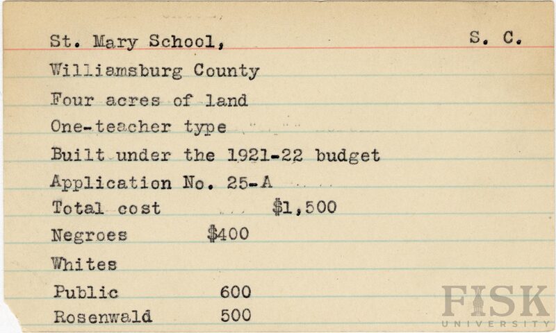 - School card from Rosenwald Fund for St. Mary School in Williamsburg County, South Carolina