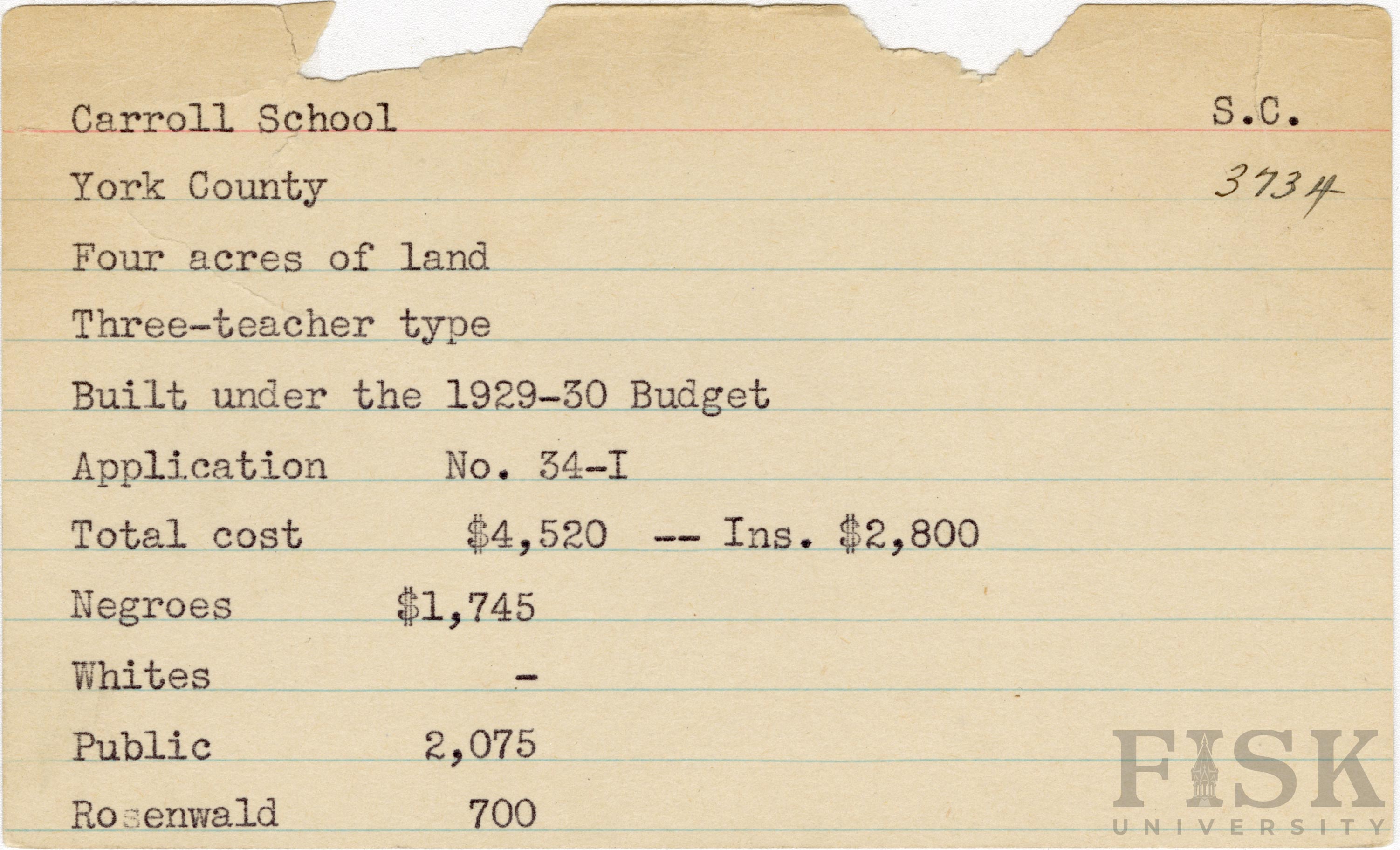 - School card from Rosenwald Fund for Carroll School in York County, South Carolina with a section added to the budget contributions that says, "Ins. $2,800"