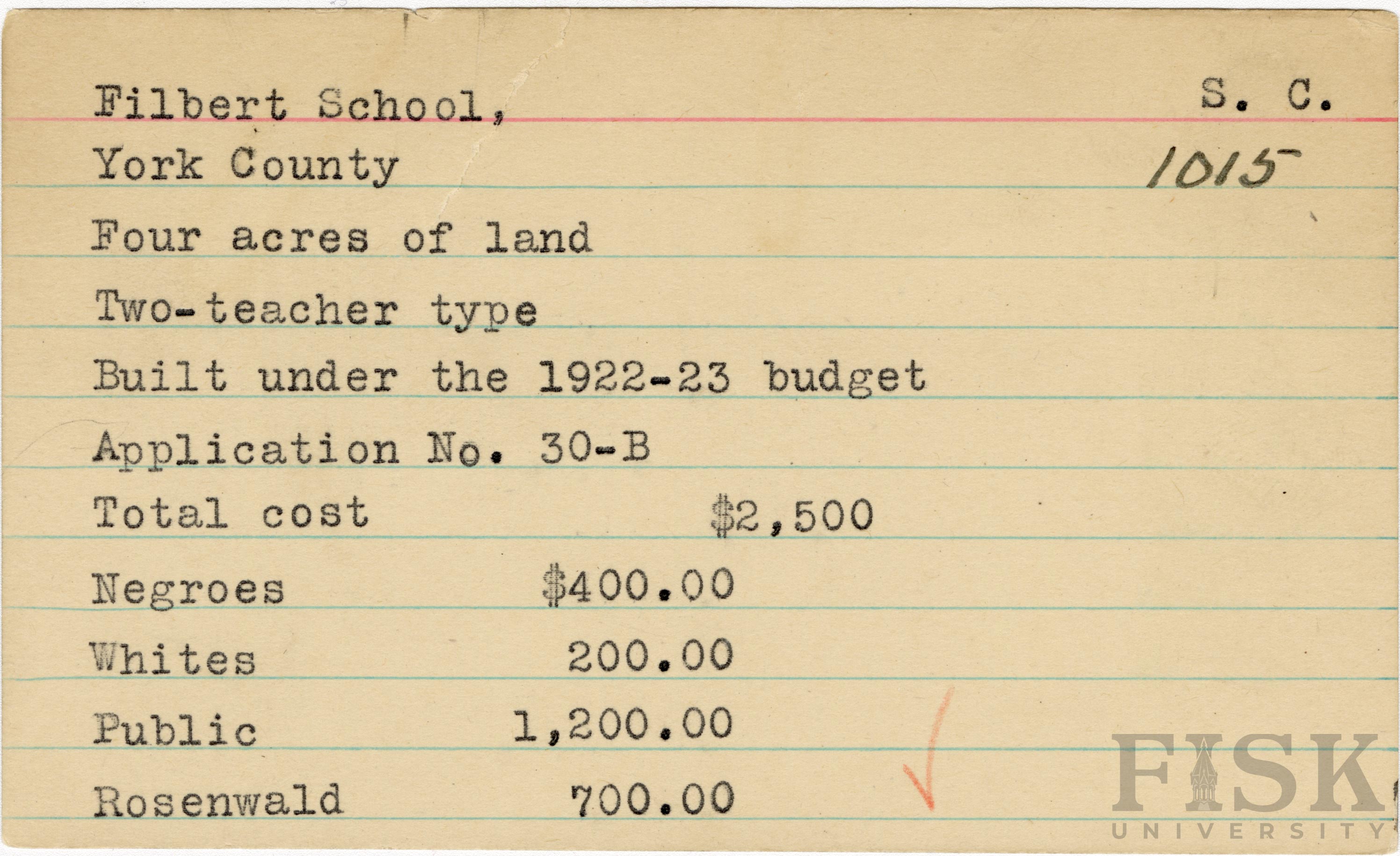 School card from Rosenwald Fund for Filbert School in York County, South Carolina